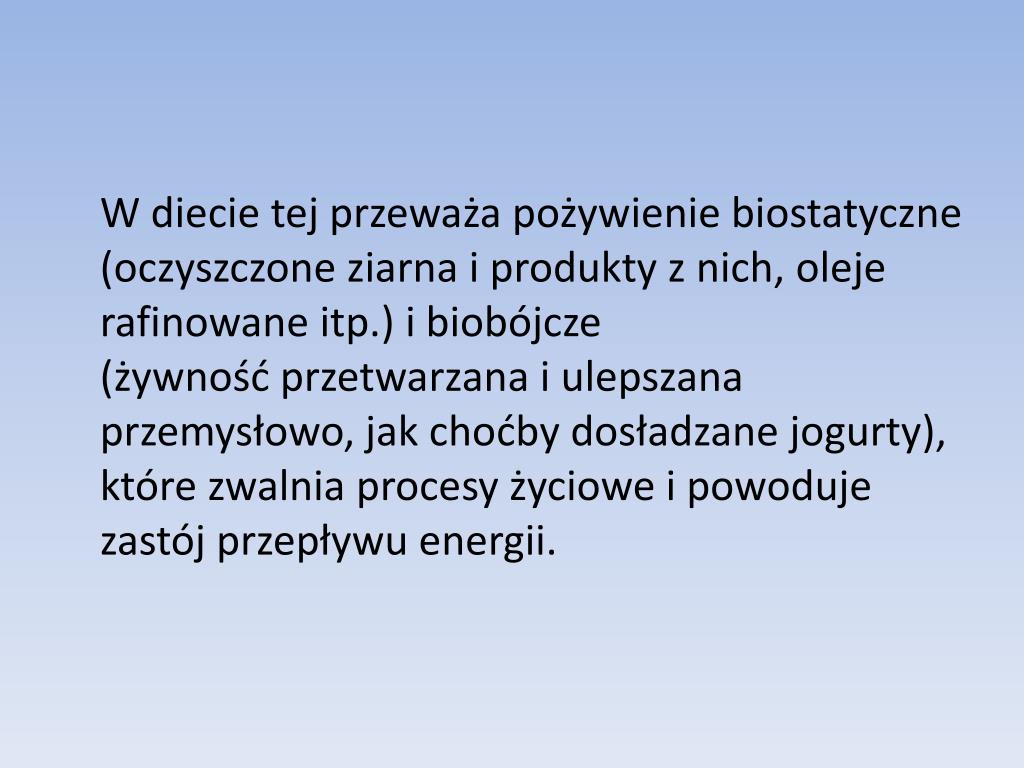 W diecie tej przeważa pożywienie biostatyczne (oczyszczone ziarna i produkty z nich, oleje rafinowane itp.) i biobójcze(żywność przetwarzana i ulepszana przemysłowo, jak choćby dosładzane jogurty), które zwalnia procesy życiowe i powoduje zastój przepływu energii.