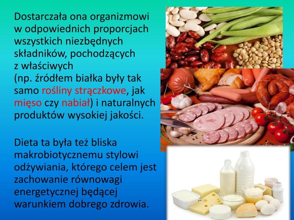 Dostarczała ona organizmowi w odpowiednich proporcjach wszystkich niezbędnych składników, pochodzących z właściwych (np. źródłem białka były tak samo rośliny strączkowe, jak mięsoczy nabiał) i naturalnych produktów wysokiej jakości. Dieta ta była też bliska makrobiotycznemu stylowi odżywiania, którego celem jest zachowanie równowagi energetycznej będącej warunkiem dobrego zdrowia.