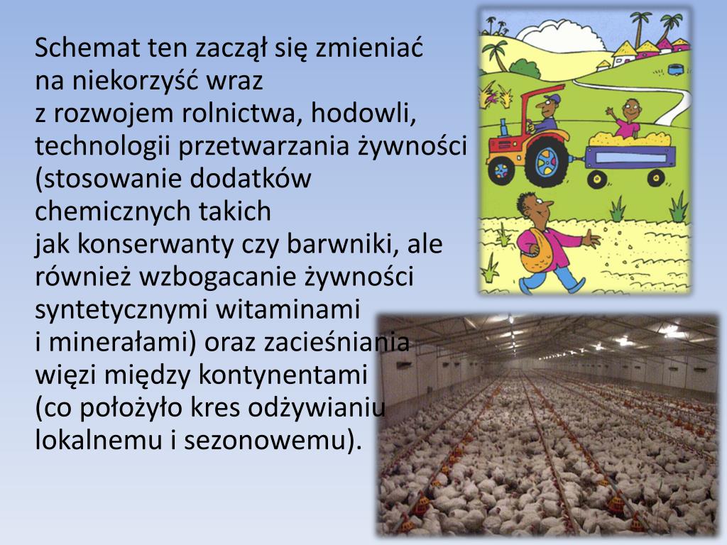 Schemat ten zaczął się zmieniać na niekorzyść wraz z rozwojem rolnictwa, hodowli, technologii przetwarzania żywności (stosowanie dodatków chemicznych takich jak konserwanty czy barwniki, ale również wzbogacanie żywności syntetycznymi witaminami i minerałami) oraz zacieśniania więzi między kontynentami (co położyło kres odżywianiu lokalnemu i sezonowemu).