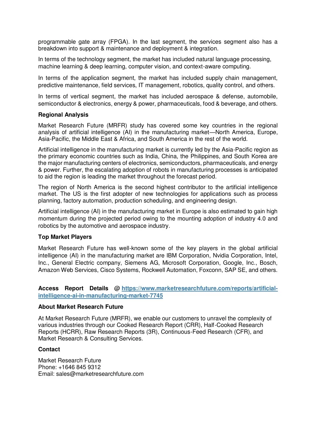 programmable gate array (FPGA). In the last segment, the services segment also has a breakdown into support & maintenance and deployment & integration. In terms of the technology segment, the market has included natural language processing, machine learning & deep learning, computer vision, and context-aware computing. In terms of the application segment, the market has included supply chain management, predictive maintenance, field services, IT management, robotics, quality control, and others. In terms of vertical segment, the market has included aerospace & defense, automobile, semiconductor & electronics, energy & power, pharmaceuticals, food & beverage, and others. Regional Analysis Market Research Future (MRFR) study has covered some key countries in the regional analysis of artificial intelligence (AI) in the manufacturing market—North America, Europe, Asia-Pacific, the Middle East & Africa, and South America in the rest of the world. Artificial intelligence in the manufacturing market is currently led by the Asia-Pacific region as the primary economic countries such as India, China, the Philippines, and South Korea are the major manufacturing centers of electronics, semiconductors, pharmaceuticals, and energy & power. Further, the escalating adoption of robots in manufacturing processes is anticipated to aid the region is leading the market throughout the forecast period. The region of North America is the second highest contributor to the artificial intelligence market. The US is the first adopter of new technologies for applications such as process planning, factory automation, production scheduling, and engineering design. Artificial intelligence (AI) in the manufacturing market in Europe is also estimated to gain high momentum during the projected period owing to the mounting adoption of industry 4.0 and robotics by the automotive and aerospace industry. Top Market Players Market Research Future has well-known some of the key players in the global artificial intelligence (AI) in the manufacturing market are IBM Corporation, Nvidia Corporation, Intel, Inc., General Electric company, Siemens AG, Microsoft Corporation, Google, Inc., Bosch, Amazon Web Services, Cisco Systems, Rockwell Automation, Foxconn, SAP SE, and others. Access Report Details @ https://www.marketresearchfuture.com/reports/artificial- intelligence-ai-in-manufacturing-market-7745 About Market Research Future At Market Research Future (MRFR), we enable our customers to unravel the complexity of various industries through our Cooked Research Report (CRR), Half-Cooked Research Reports (HCRR), Raw Research Reports (3R), Continuous-Feed Research (CFR), and Market Research & Consulting Services. Contact Market Research Future Phone: +1646 845 9312 Email: sales@marketresearchfuture.com