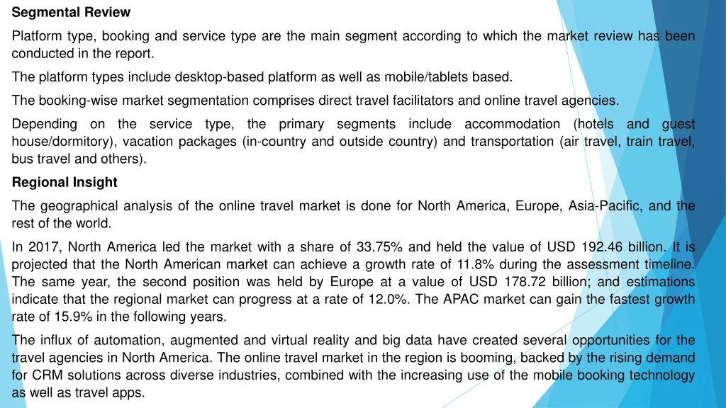 Segmental Review Platform type, booking and service type are the main segment according to which the market review has been conducted in the report. The platform types include desktop-based platform as well as mobile/tablets based. The booking-wise market segmentation comprises direct travel facilitators and online travel agencies. Depending on the service type, the primary segments include accommodation (hotels and guest house/dormitory), vacation packages (in-country and outside country) and transportation (air travel, train travel, bus travel and others). Regional Insight The geographical analysis of the online travel market is done for North America, Europe, Asia-Pacific, and the rest of the world. In 2017, North America led the market with a share of 33.75% and held the value of USD 192.46 billion. It is projected that the North American market can achieve a growth rate of 11.8% during the assessment timeline. The same year, the second position was held by Europe at a value of USD 178.72 billion; and estimations indicate that the regional market can progress at a rate of 12.0%. The APAC market can gain the fastest growth rate of 15.9% in the following years. The influx of automation, augmented and virtual reality and big data have created several opportunities for the travel agencies in North America. The online travel market in the region is booming, backed by the rising demand for CRM solutions across diverse industries, combined with the increasing use of the mobile booking technology as well as travel apps.