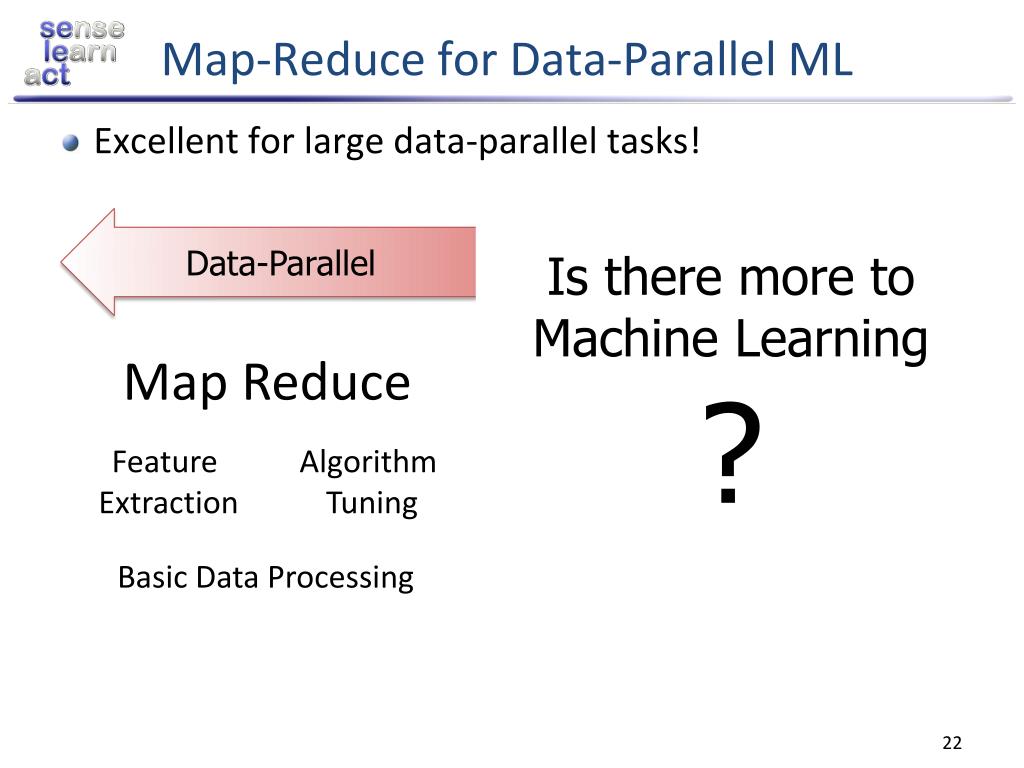 Map-Reduce for Data-Parallel ML • Excellent for large data-parallel tasks! Data-ParallelGraph-Parallel Map Reduce Bulk Synchronous? Map Reduce? SVM Lasso Feature Extraction Cross Validation Belief Propagation Kernel Methods Computing Sufficient Statistics Tensor Factorization PageRank Neural Networks Deep Belief Networks