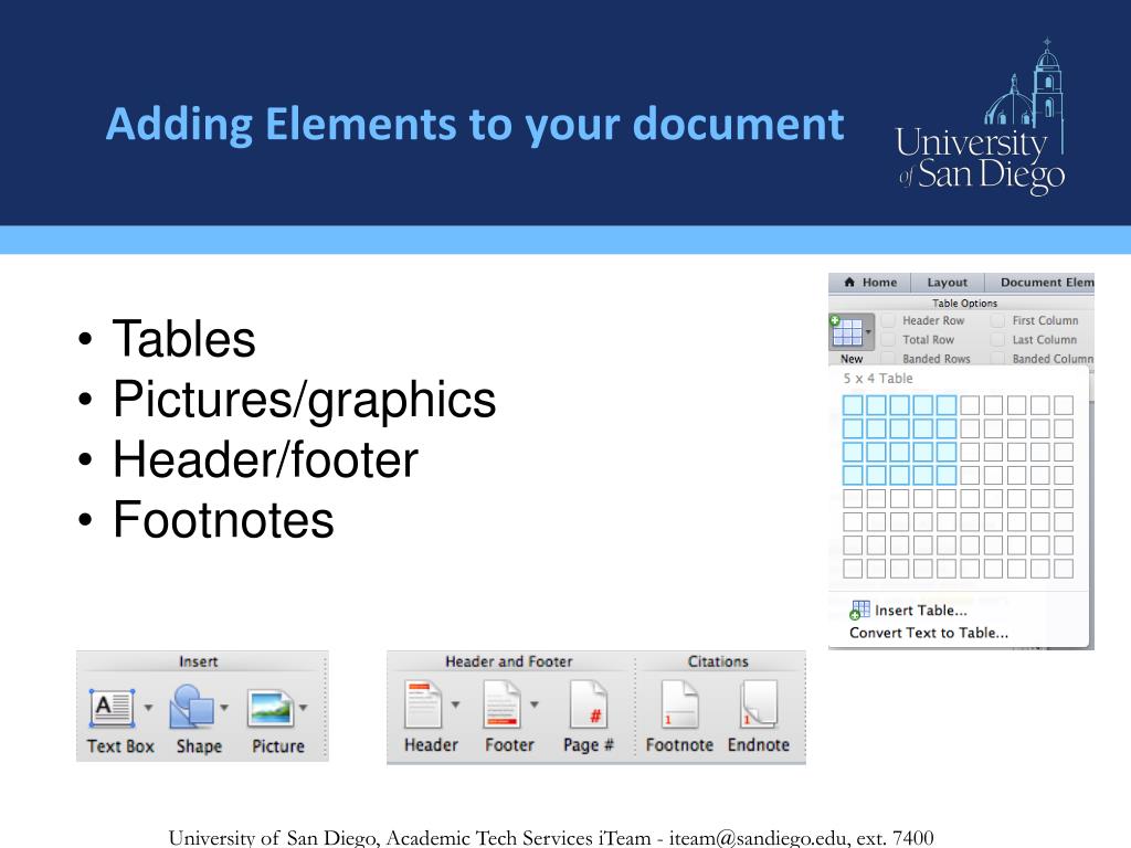 Adding Elements to your document • Tables • Pictures/graphics • Header/footer • Footnotes University of San Diego, Academic Tech Services iTeam - iteam@sandiego.edu, ext. 7400