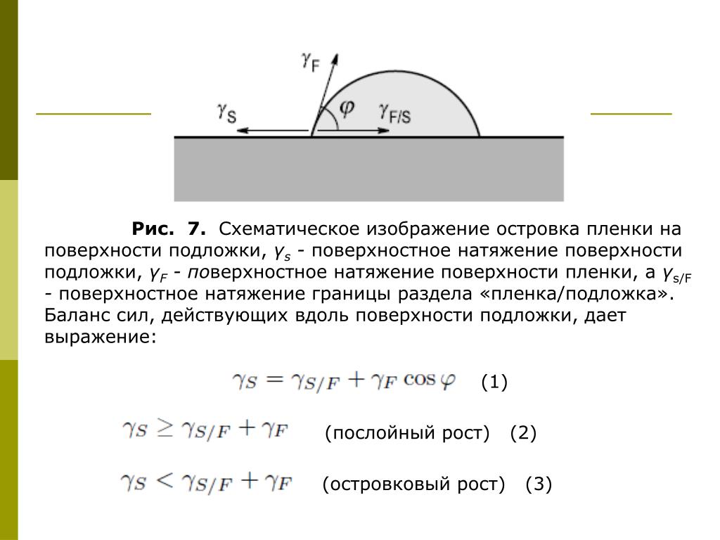 Рис. 7. Схематическое изображение островка пленки на поверхности подложки, γs- поверхностное натяжение поверхности подложки, γF- поверхностное натяжение поверхности пленки, a γs/F-поверхностное натяжение границы раздела «пленка/подложка». Баланс сил, действующих вдоль поверхности подложки, дает выражение: (1) (послойный рост) (2) (островковый рост) (3)