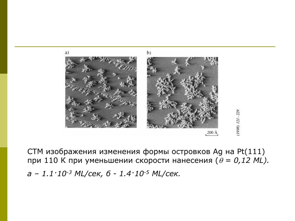 СТМ изображения изменения формы островков Ag на Pt(111) при 110 К при уменьшении скорости нанесения ( = 0,12 ML). а – 1.1·10-3ML/сек, б - 1.4·10-5ML/сек.