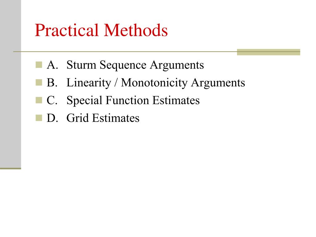 Practical Methods • A. Sturm Sequence Arguments • B. Linearity / Monotonicity Arguments • C. Special Function Estimates • D. Grid Estimates