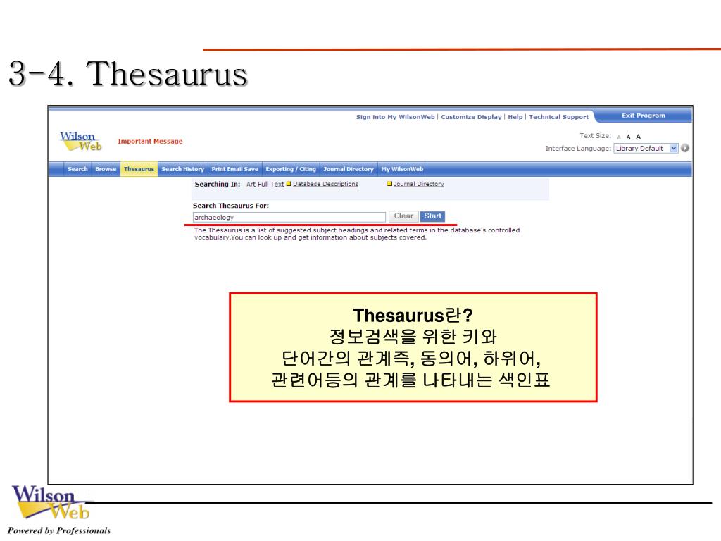 3-4. Thesaurus Thesaurus란?정보검색을 위한 키와 단어간의 관계즉, 동의어, 하위어, 관련어등의 관계를 나타내는 색인표