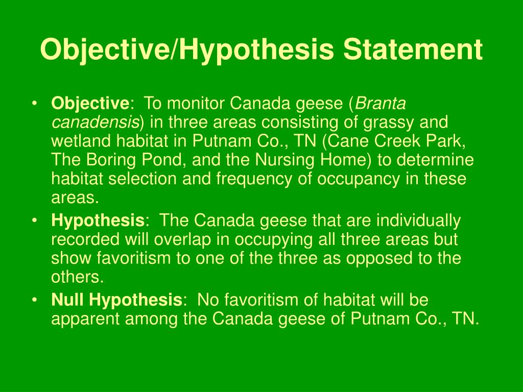Objective/Hypothesis Statement • Objective: To monitor Canada geese (Branta canadensis) in three areas consisting of grassy and wetland habitat in Putnam Co., TN (Cane Creek Park, The Boring Pond, and the Nursing Home) to determine habitat selection and frequency of occupancy in these areas. • Hypothesis: The Canada geese that are individually recorded will overlap in occupying all three areas but show favoritism to one of the three as opposed to the others. • Null Hypothesis: No favoritism of habitat will be apparent among the Canada geese of Putnam Co., TN.