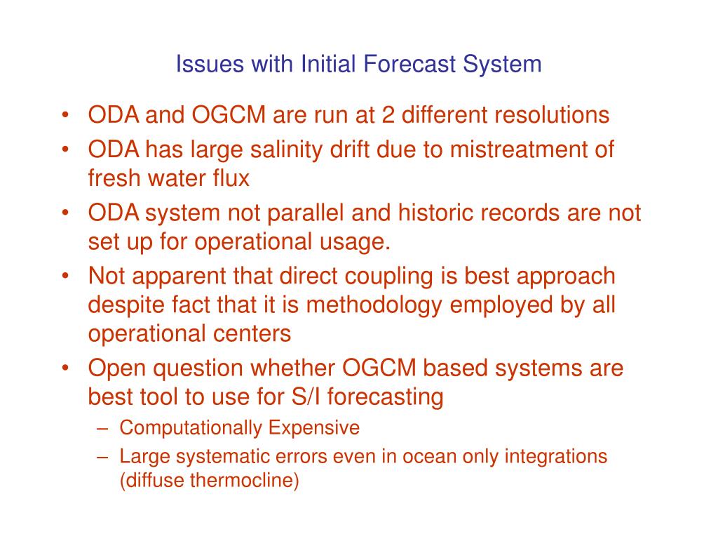 Issues with Initial Forecast System • ODA and OGCM are run at 2 different resolutions • ODA has large salinity drift due to mistreatment of fresh water flux • ODA system not parallel and historic records are not set up for operational usage. • Not apparent that direct coupling is best approach despite fact that it is methodology employed by all operational centers • Open question whether OGCM based systems are best tool to use for S/I forecasting • Computationally Expensive • Large systematic errors even in ocean only integrations (diffuse thermocline)