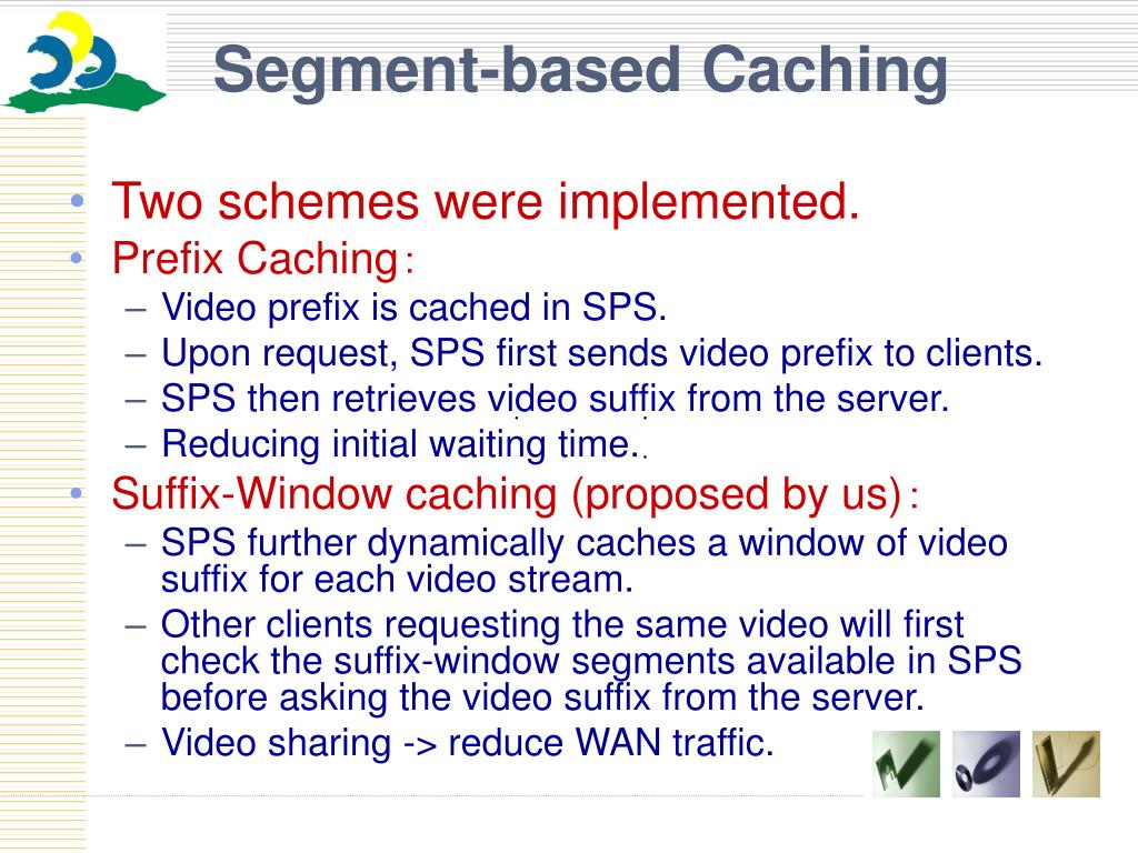 Segment-based Caching • Two schemes were implemented. • Prefix Caching: • Video prefix is cached in SPS. • Upon request, SPS first sends video prefix to clients. • SPS then retrieves video suffix from the server. • Reducing initial waiting time. • Suffix-Window caching (proposed by us): • SPS further dynamically caches a window of video suffix for each video stream. • Other clients requesting the same video will first check the suffix-window segments available in SPS before asking the video suffix from the server. • Video sharing -> reduce WAN traffic.