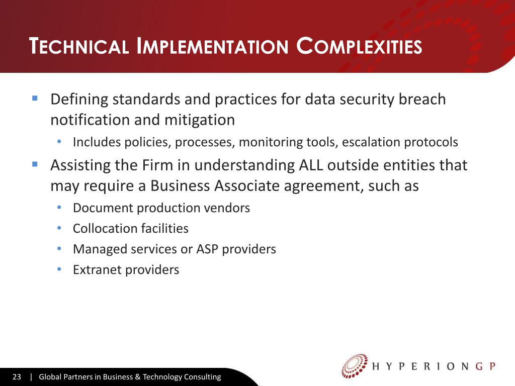 Technical Implementation Complexities • Defining standards and practices for data security breach notification and mitigation • Includes policies, processes, monitoring tools, escalation protocols • Assisting the Firm in understanding ALL outside entities that may require a Business Associate agreement, such as • Document production vendors • Collocation facilities • Managed services or ASP providers • Extranet providers