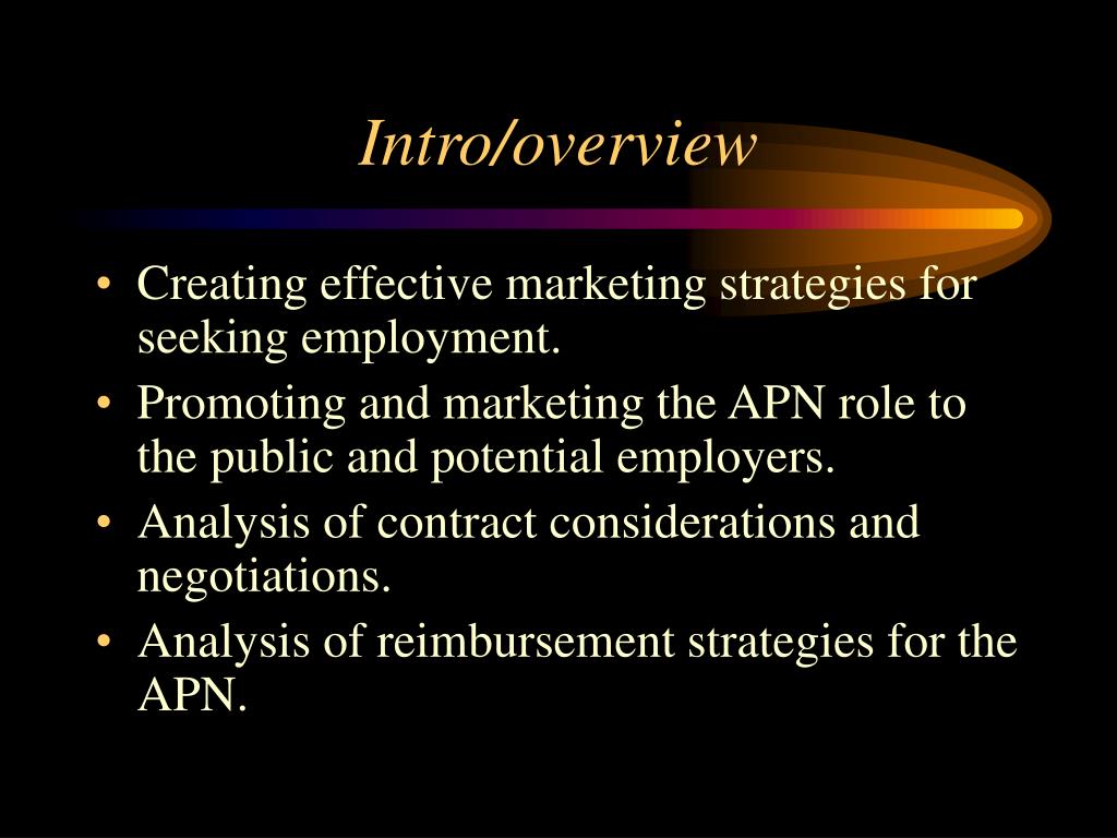 Intro/overview • Creating effective marketing strategies for seeking employment. • Promoting and marketing the APN role to the public and potential employers. • Analysis of contract considerations and negotiations. • Analysis of reimbursement strategies for the APN.