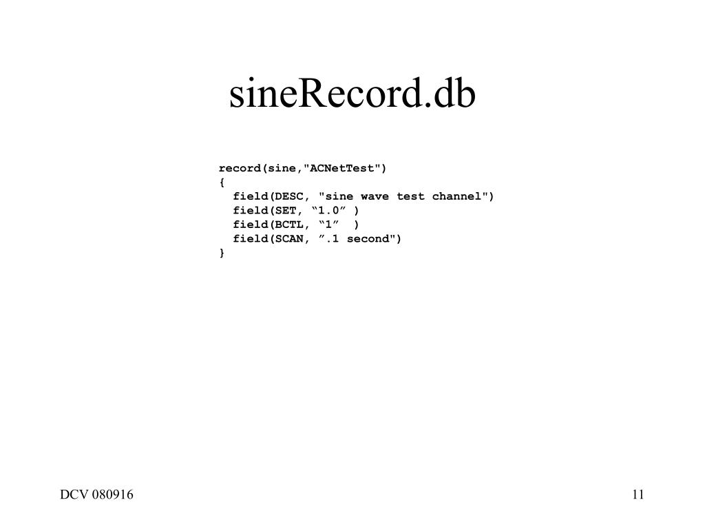 sineRecord.db record(sine,"ACNetTest") { field(DESC, "sine wave test channel") field(SET, “1.0” ) field(BCTL, “1” ) field(SCAN, ”.1 second") }