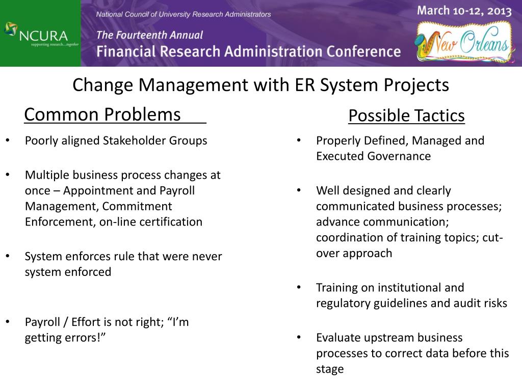 Common Problems Possible Tactics Change Management with ER System Projects Poorly aligned Stakeholder Groups Multiple business process changes at once – Appointment and Payroll Management, Commitment Enforcement, on-line certification System enforces rule that were never system enforced Payroll / Effort is not right; “I’m getting errors!” Properly Defined, Managed and Executed Governance Well designed and clearly communicated business processes; advance communication; coordination of training topics; cut-over approach Training on institutional and regulatory guidelines and audit risks Evaluate upstream business processes to correct data before this stage