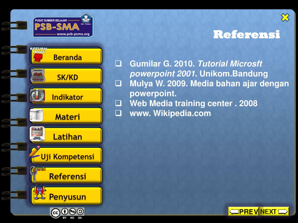 Referensi • Gumilar G. 2010. Tutorial Microsftpowerpoint 2001. Unikom.Bandung • Mulya W. 2009. Media bahan ajar denganpowerpoint. • Web Media training center . 2008 • www. Wikipedia.com
