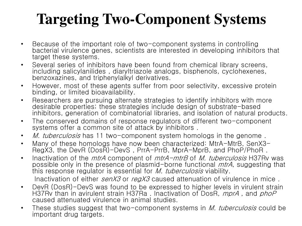 Targeting Two-Component Systems • Because of the important role of two-component systems in controlling bacterial virulence genes, scientists are interested in developing inhibitors that target these systems. • Several series of inhibitors have been found from chemical library screens, including salicylanilides , diaryltriazole analogs, bisphenols, cyclohexenes, benzoxazines, and triphenylalkyl derivatives. • However, most of these agents suffer from poor selectivity, excessive protein binding, or limited bioavailability. • Researchers are pursuing alternate strategies to identify inhibitors with more desirable properties; these strategies include design of substrate-based inhibitors, generation of combinatorial libraries, and isolation of natural products. • The conserved domains of response regulators of different two-component systems offer a common site of attack by inhibitors . • M. tuberculosis has 11 two-component system homologs in the genome . • Many of these homologs have now been characterized: MtrA-MtrB, SenX3- RegX3, the DevR (DosR)-DevS , PrrA-PrrB, MprA-MprB, and PhoP/PhoR . • Inactivation of the mtrA component of mtrA-mtrB of M. tuberculosis H37Rv was possible only in the presence of plasmid-borne functional mtrA, suggesting that this response regulator is essential for M. tuberculosis viability. Inactivation of either senX3 or regX3 caused attenuation of virulence in mice . • DevR (DosR)-DevS was found to be expressed to higher levels in virulent strain H37Rv than in avirulent strain H37Ra . Inactivation of DosR, mprA , and phoP caused attenuated virulence in animal studies. • These studies suggest that two-component systems in M. tuberculosis could be important drug targets.
