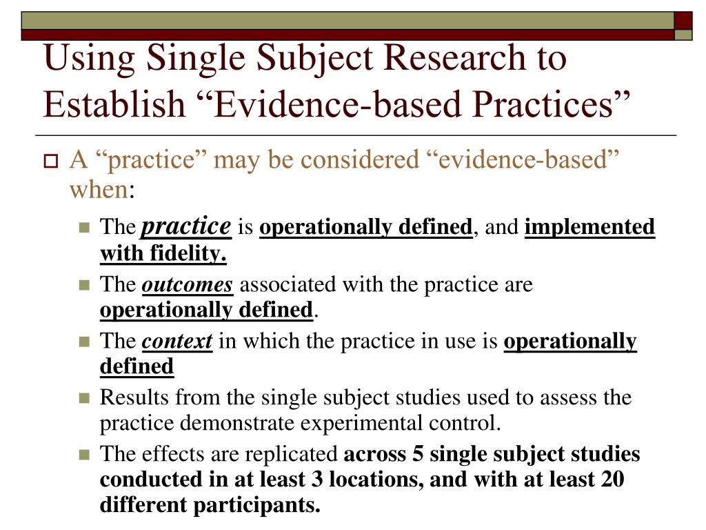 Using Single Subject Research to Establish “Evidence-based Practices” • A “practice” may be considered “evidence-based” when: • The practice is operationally defined, and implemented with fidelity. • The outcomes associated with the practice are operationally defined. • The context in which the practice in use is operationally defined • Results from the single subject studies used to assess the practice demonstrate experimental control. • The effects are replicated across 5 single subject studies conducted in at least 3 locations, and with at least 20 different participants.