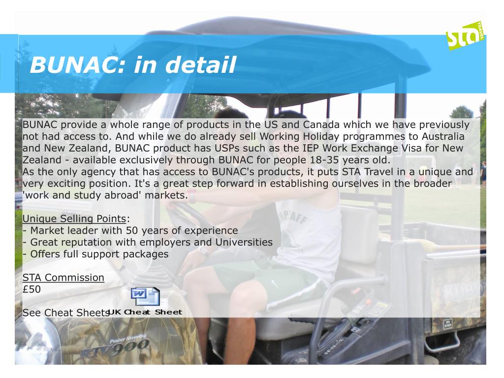 BUNAC: in detail BUNAC provide a whole range of products in the US and Canada which we have previously not had access to. And while we do already sell Working Holiday programmes to Australia and New Zealand, BUNAC product has USPs such as the IEP Work Exchange Visa for New Zealand - available exclusively through BUNAC for people 18-35 years old. As the only agency that has access to BUNAC's products, it puts STA Travel in a unique and very exciting position. It's a great step forward in establishing ourselves in the broader 'work and study abroad' markets. Unique Selling Points: - Market leader with 50 years of experience - Great reputation with employers and Universities - Offers full support packages STA Commission £50 See Cheat Sheets