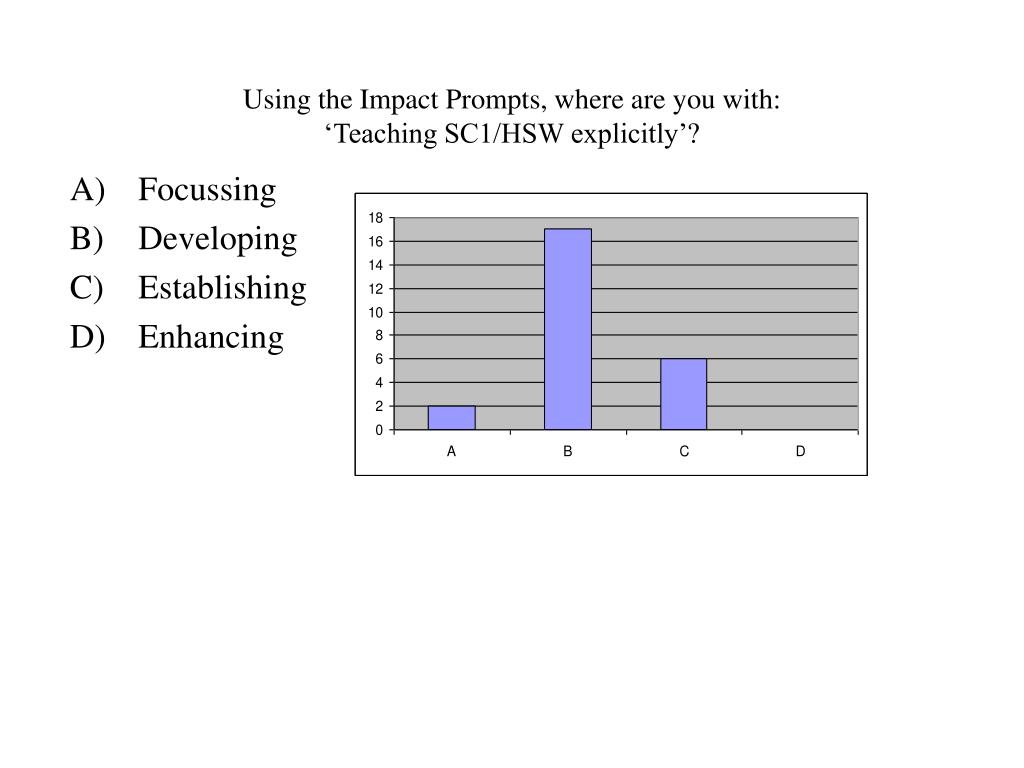Using the Impact Prompts, where are you with: ‘Teaching SC1/HSW explicitly’? • Focussing • Developing • Establishing • Enhancing