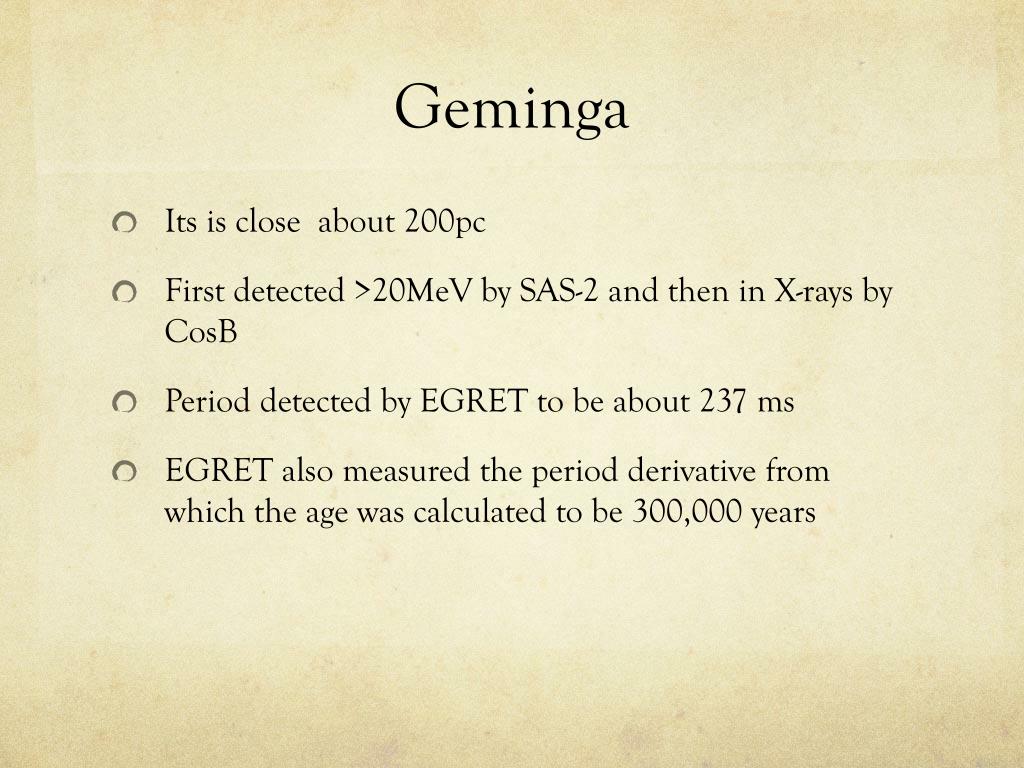 Geminga • Its is close about 200pc • First detected >20MeV by SAS-2 and then in X-rays by CosB • Period detected by EGRET to be about 237 ms • EGRET also measured the period derivative from which the age was calculated to be 300,000 years