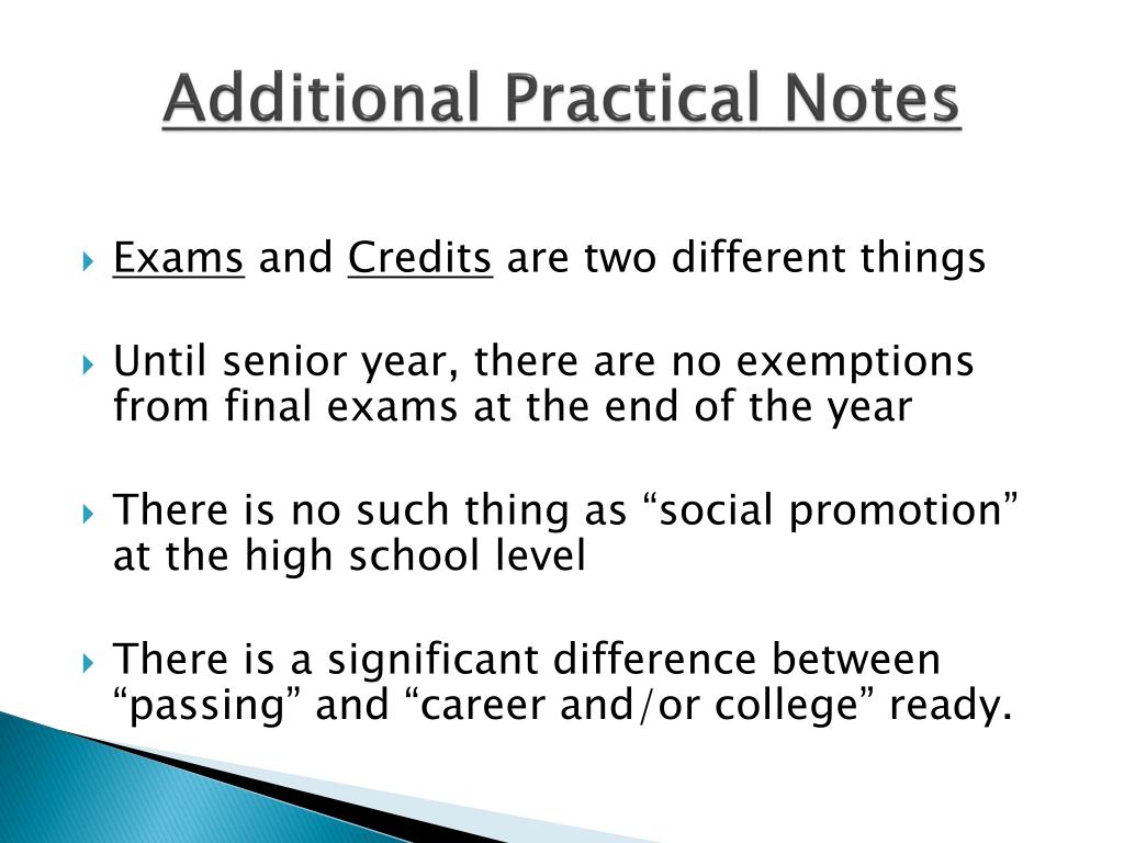 Additional Practical Notes • Exams and Credits are two different things • Until senior year, there are no exemptions from final exams at the end of the year • There is no such thing as “social promotion” at the high school level • There is a significant difference between “passing” and “career and/or college” ready.