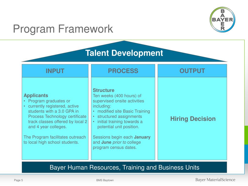 Program Framework Talent Development INPUT OUTPUT PROCESS • Structure • Ten weeks (400 hours) of supervised onsite activities including: • modified site Basic Training • structured assignments • initial training towards a potential unit position. • Sessions begin each January and Juneprior to college program census dates. Hiring Decision • Applicants • Program graduates or • currently registered, active students with a 3.0 GPA in Process Technology certificate track classes offered by local 2 and 4 year colleges. • The Program facilitates outreach to local high school students. Bayer Human Resources, Training and Business Units BMS Baytown