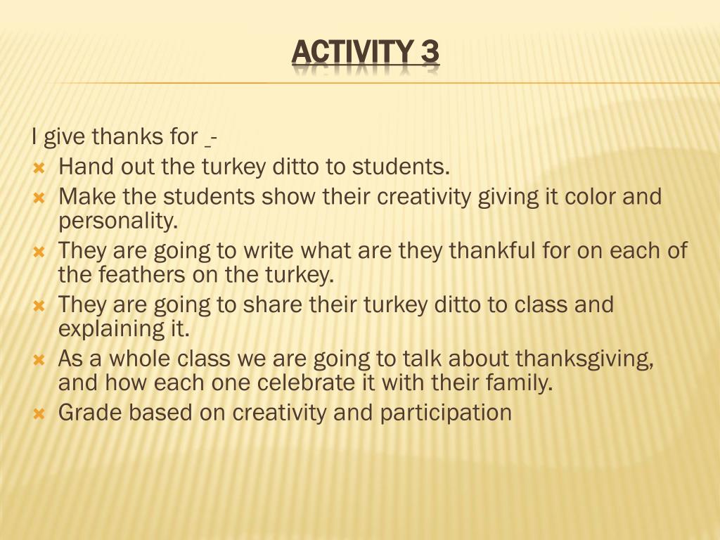 I give thanks for - • Hand out the turkey ditto to students. • Make the students show their creativity giving it color and personality. • They are going to write what are they thankful for on each of the feathers on the turkey. • They are going to share their turkey ditto to class and explaining it. • As a whole class we are going to talk about thanksgiving, and how each one celebrate it with their family. • Grade based on creativity and participation Activity 3