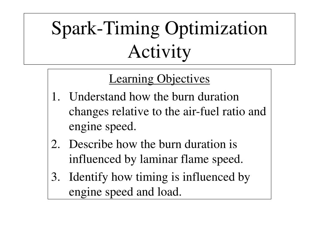 Spark-Timing Optimization Activity. Learning Objectives Understand how the burn duration changes relative to the air-fuel ratio and engine speed. Describe how the burn duration is influenced by laminar flame speed. Identify how timing is influenced by engine speed and load.