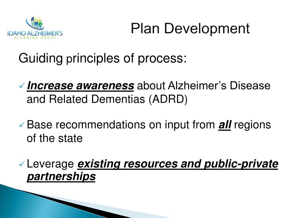 Plan Development Guiding principles of process: • Increase awarenessabout Alzheimer’s Disease and Related Dementias (ADRD) • Base recommendations on input from all regions of the state • Leverage existing resources and public-private partnerships