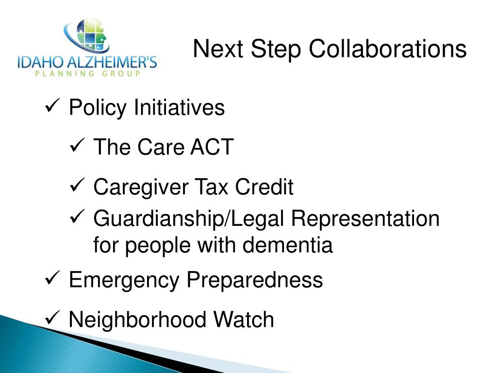 Next Step Collaborations • Policy Initiatives • The Care ACT • Caregiver Tax Credit • Guardianship/Legal Representation for people with dementia • Emergency Preparedness • Neighborhood Watch