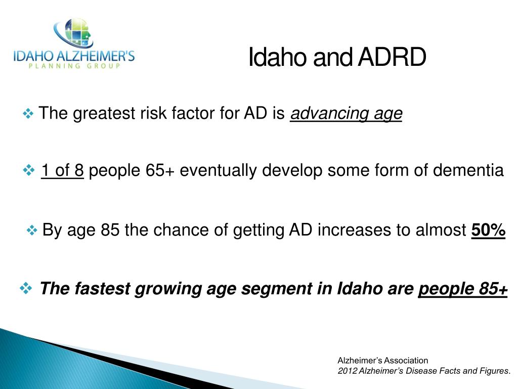 Idaho and ADRD • The greatest risk factor for AD is advancing age • 1 of 8 people 65+ eventually develop some form of dementia • By age 85 the chance of getting AD increases to almost 50% • The fastest growing age segment in Idaho are people 85+ Alzheimer’s Association 2012 Alzheimer’s Disease Facts and Figures.