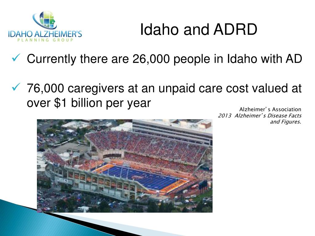 Idaho and ADRD • Currently there are 26,000 people in Idaho with AD • 76,000 caregivers at an unpaid care cost valued at over $1 billion per year Alzheimer’s Association 2013 Alzheimer’s Disease Facts and Figures.