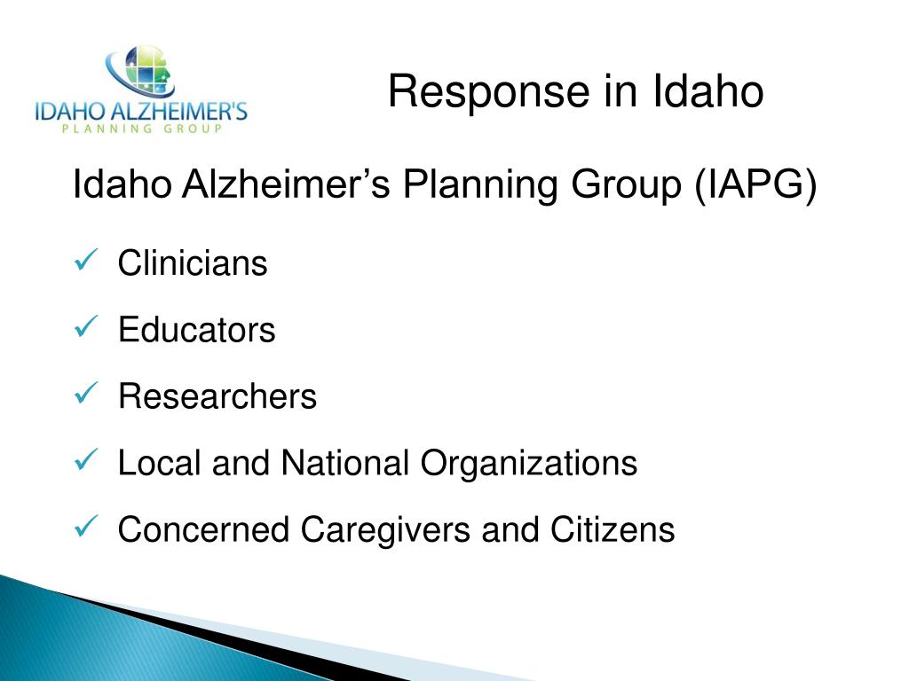 Response in Idaho Idaho Alzheimer’s Planning Group (IAPG) • Clinicians • Educators • Researchers • Local and National Organizations • Concerned Caregivers and Citizens