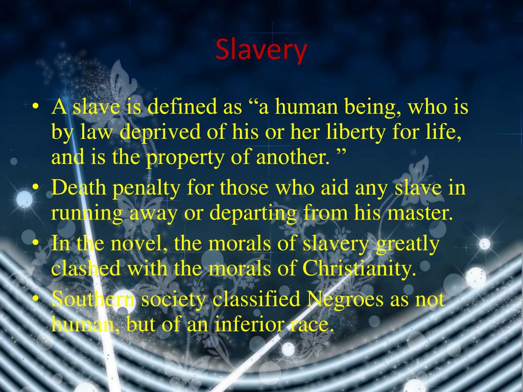 Slavery • A slave is defined as “a human being, who is by law deprived of his or her liberty for life, and is the property of another. ” • Death penalty for those who aid any slave in running away or departing from his master. • In the novel, the morals of slavery greatly clashed with the morals of Christianity. • Southern society classified Negroes as not human, but of an inferior race.