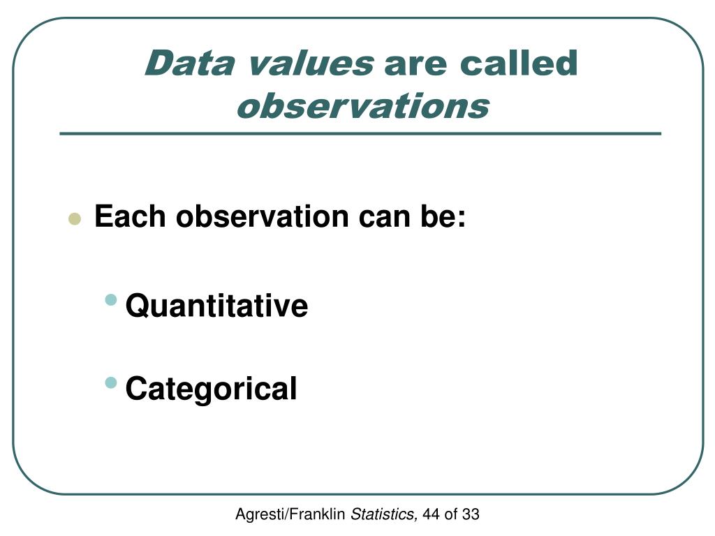 Data values are called observations • Each observation can be: • Quantitative • Categorical