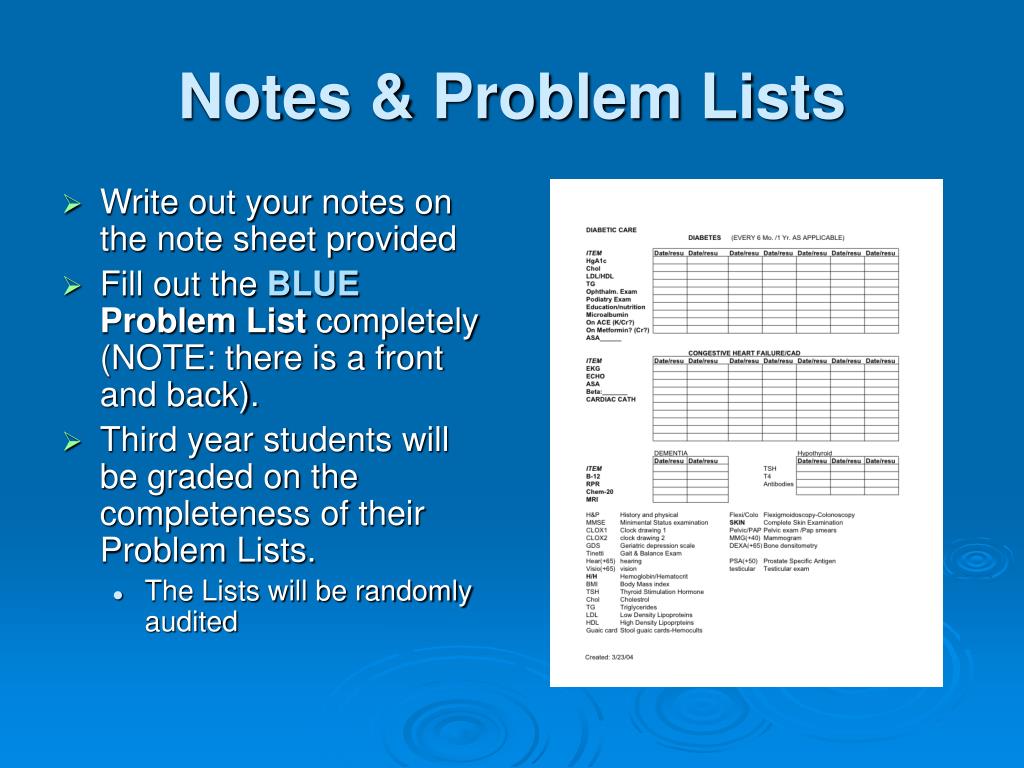 Notes & Problem Lists • Write out your notes on the note sheet provided • Fill out the BLUEProblem List completely (NOTE: there is a front and back). • Third year students will be graded on the completeness of their Problem Lists. • The Lists will be randomly audited
