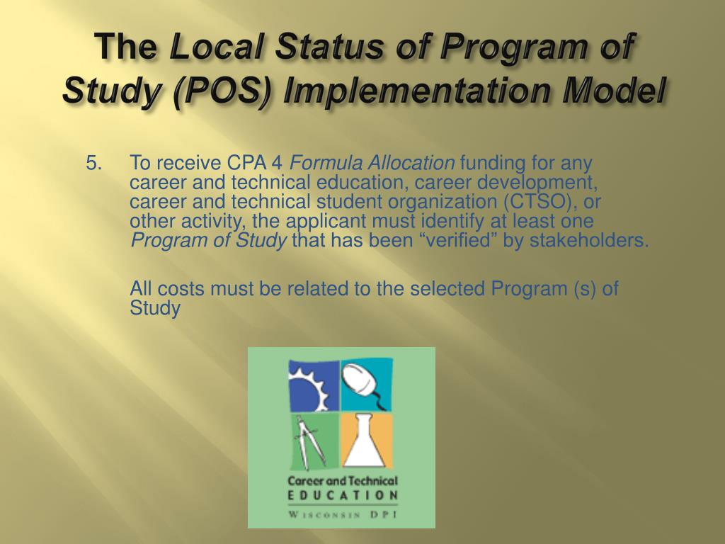 The Local Status of Program of Study (POS) Implementation Model 5. To receive CPA 4 Formula Allocation funding for any career and technical education, career development, career and technical student organization (CTSO), or other activity, the applicant must identify at least one Program of Study that has been “verified” by stakeholders. All costs must be related to the selected Program (s) of Study