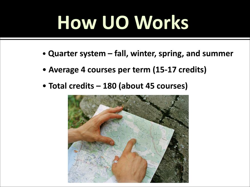 How UO Works • Quarter system – fall, winter, spring, and summer • Average 4 courses per term (15-17 credits) • Total credits – 180 (about 45 courses)