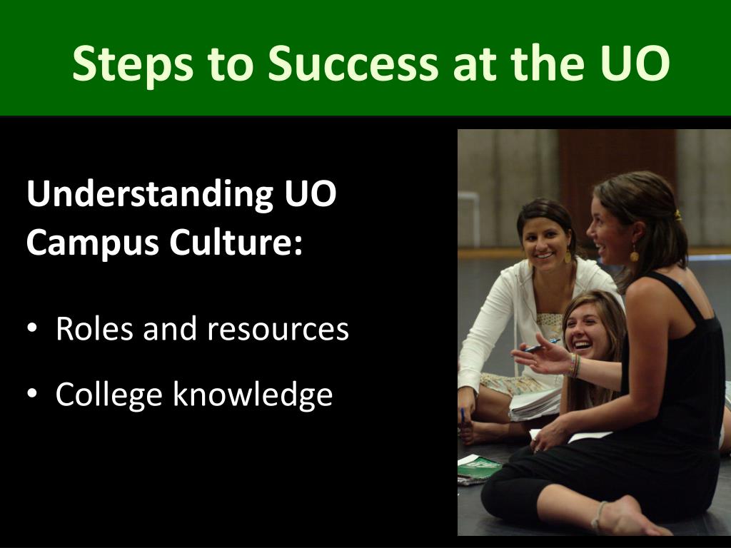 Steps to Success at the UO • Understanding UO Campus Culture: • Roles and resources • College knowledge