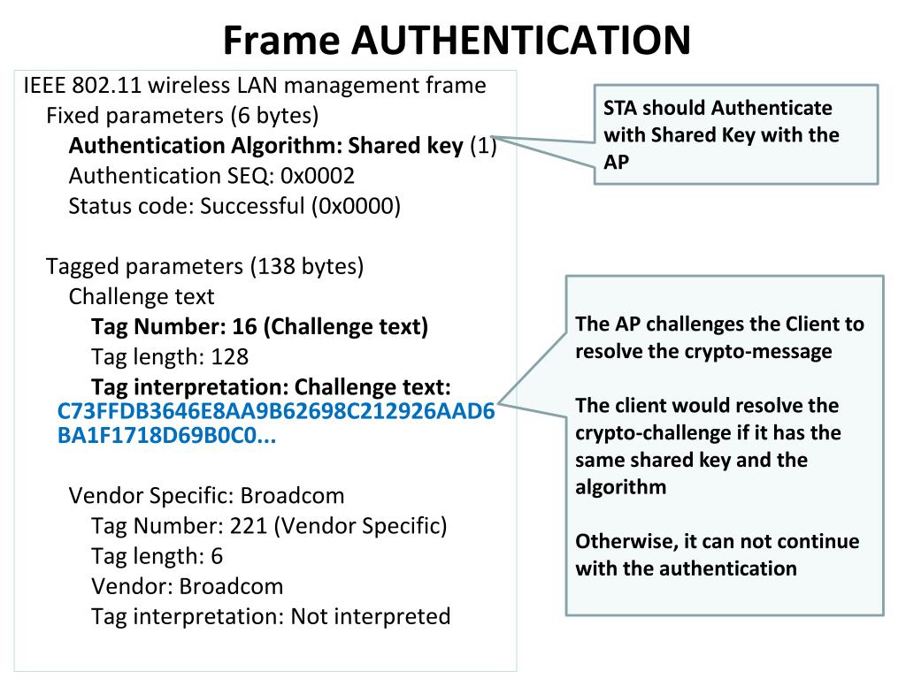 Frame AUTHENTICATION STA should Authenticate with Shared Key with the AP IEEE 802.11 wireless LAN management frame Fixed parameters (6 bytes) Authentication Algorithm: Shared key (1) Authentication SEQ: 0x0002 Status code: Successful (0x0000) Tagged parameters (138 bytes) Challenge text Tag Number: 16 (Challenge text) Tag length: 128 Tag interpretation: Challenge text: C73FFDB3646E8AA9B62698C212926AAD6BA1F1718D69B0C0... Vendor Specific: Broadcom Tag Number: 221 (Vendor Specific) Tag length: 6 Vendor: Broadcom Tag interpretation: Not interpreted The AP challenges the Client to resolve the crypto-message The client would resolve the crypto-challenge if it has the same shared key and the algorithm Otherwise, it can not continue with the authentication