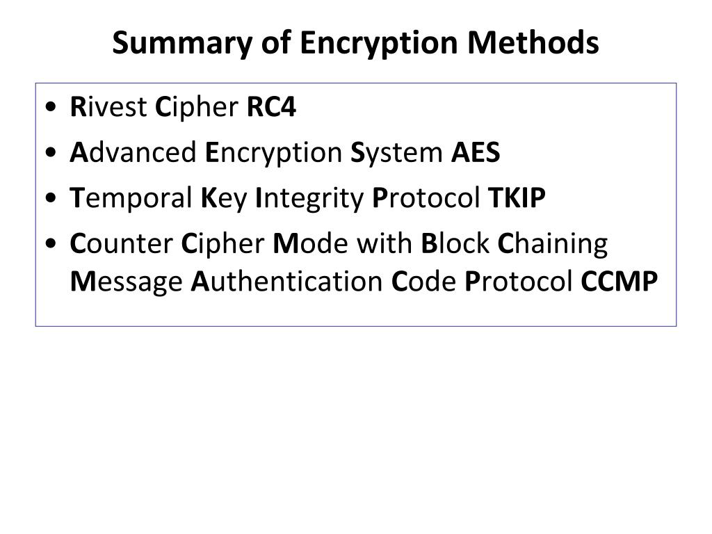 Summary of Encryption Methods • Rivest Cipher RC4 • Advanced Encryption System AES • Temporal Key Integrity Protocol TKIP • Counter Cipher Modewith Block Chaining Message Authentication Code Protocol CCMP