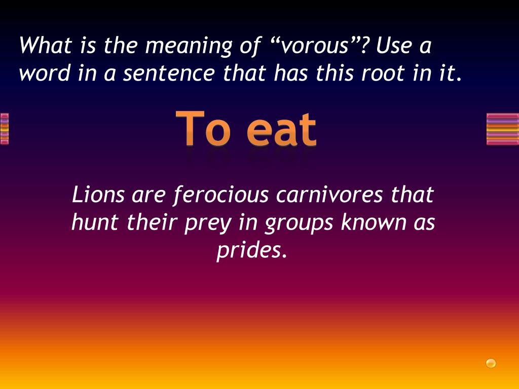 What is the meaning of “vorous”? Use a word in a sentence that has this root in it. To eat Lions are ferocious carnivores that hunt their prey in groups known as prides.