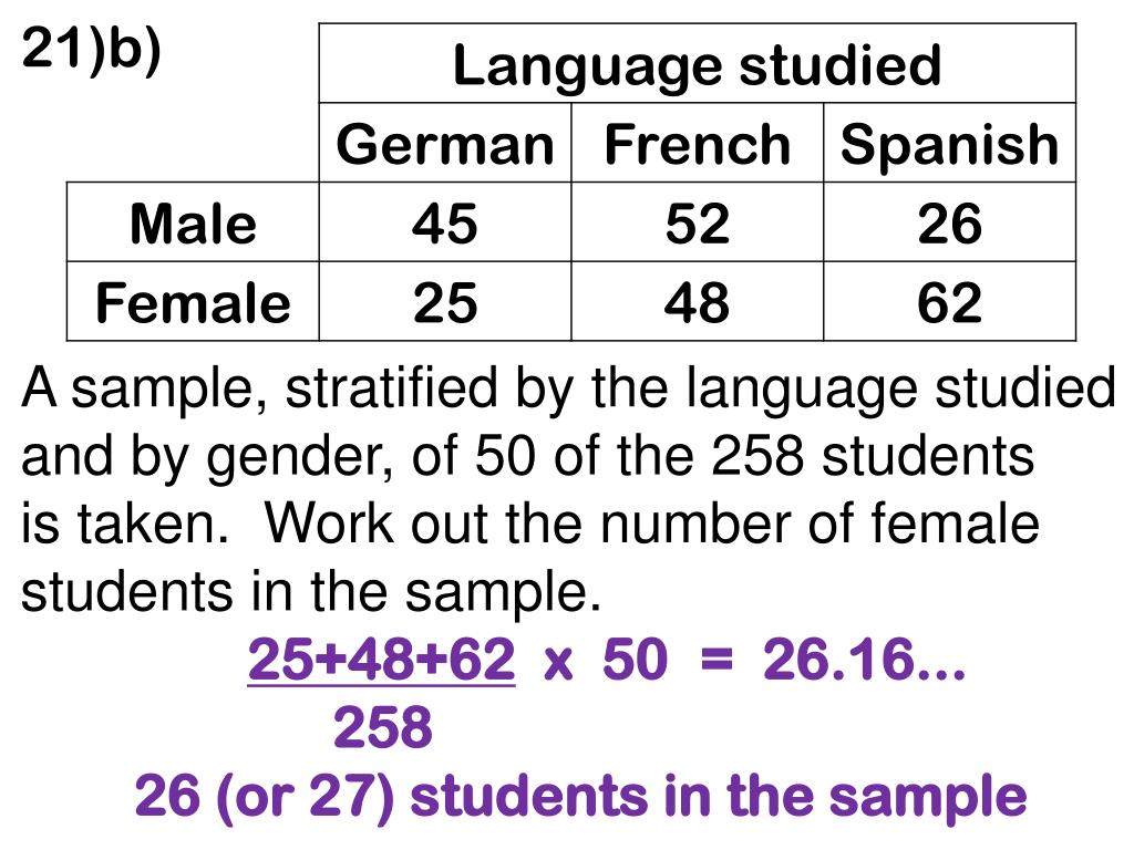 21)b) A sample, stratified by the language studied and by gender, of 50 of the 258 students is taken. Work out the number of female students in the sample. 25+48+62 x 50 = 26.16... 258 26 (or 27) students in the sample