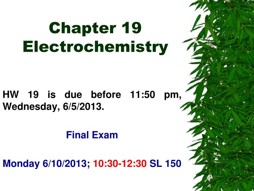 Chapter 19Electrochemistry HW 19 is due before 11:50 pm, Wednesday, 6/5/2013. Final Exam Monday 6/10/2013; 10:30-12:30 SL 150