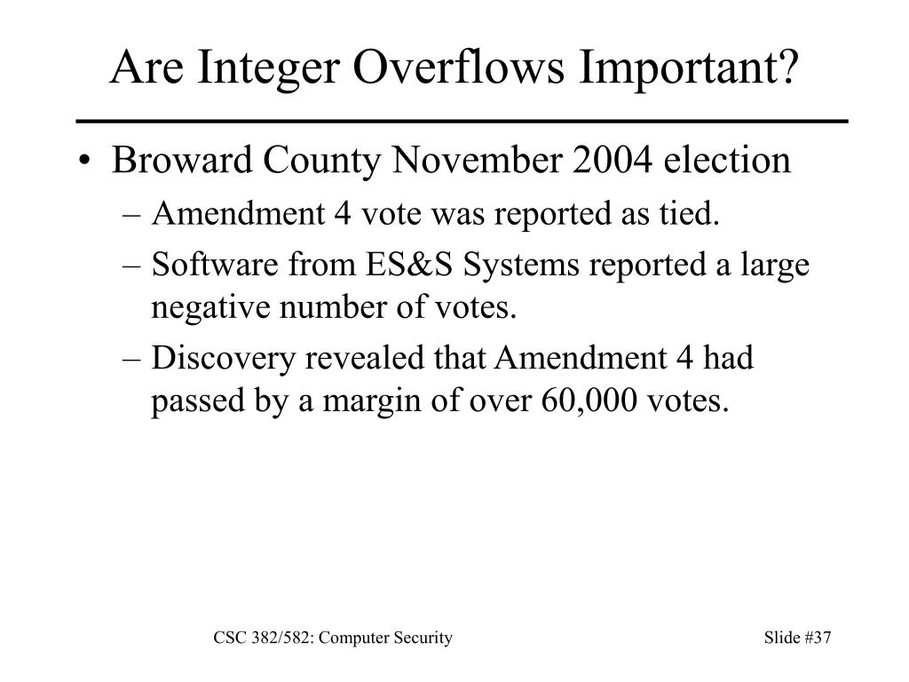Are Integer Overflows Important? • Broward County November 2004 election • Amendment 4 vote was reported as tied. • Software from ES&S Systems reported a large negative number of votes. • Discovery revealed that Amendment 4 had passed by a margin of over 60,000 votes. CSC 382/582: Computer Security