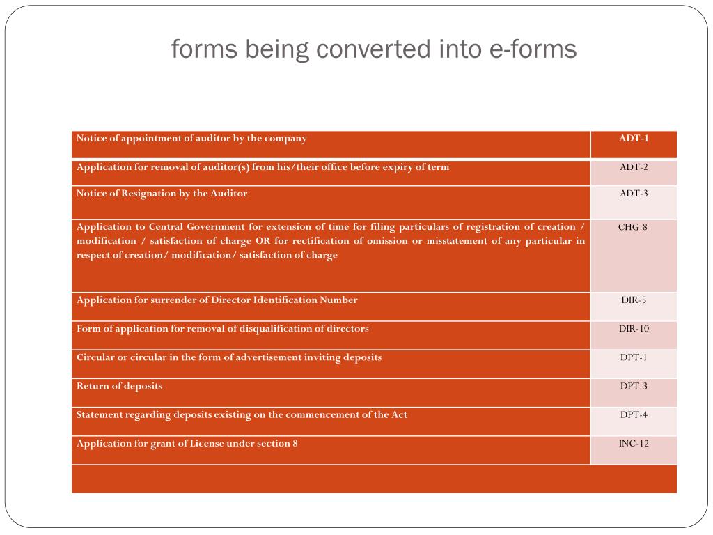 E-forms • Pre-certification of forms; • OPCs and Small companies Are exempted from pre-certification; • 15 days time allowed to resubmission/PUCL; • It is restricted to one time; • ROC can examine the documents filed under STP mode; • Resolutions passed by the board required to be filed by company; • Reduced rate of fees for OPCs and small companies;