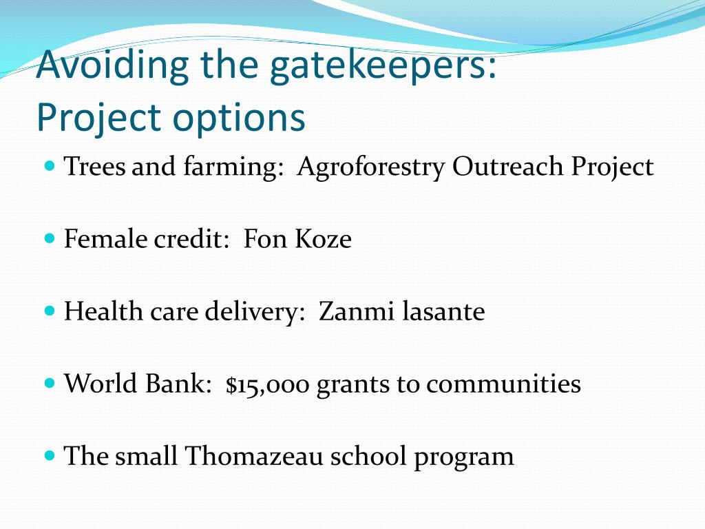 Avoiding the gatekeepers:Project options • Trees and farming: Agroforestry Outreach Project • Female credit: FonKoze • Health care delivery: Zanmilasante • World Bank: $15,000 grants to communities • The small Thomazeau school program