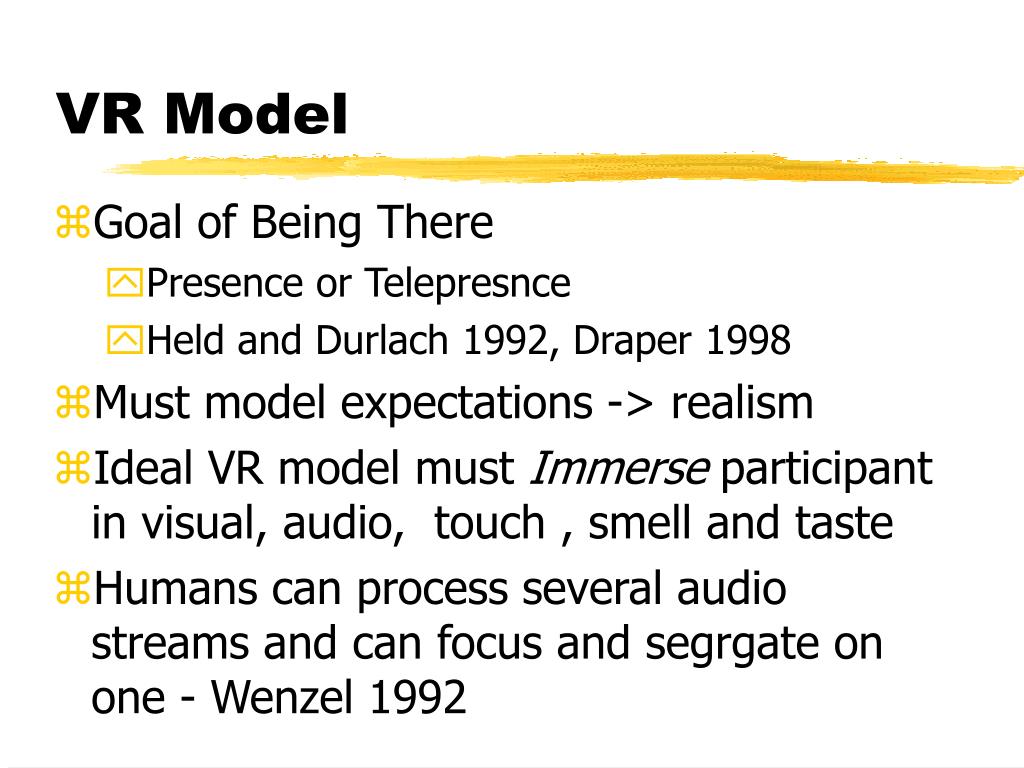 VR Model • Goal of Being There • Presence or Telepresnce • Held and Durlach 1992, Draper 1998 • Must model expectations -> realism • Ideal VR model must Immerse participant in visual, audio, touch , smell and taste • Humans can process several audio streams and can focus and segrgate on one - Wenzel 1992