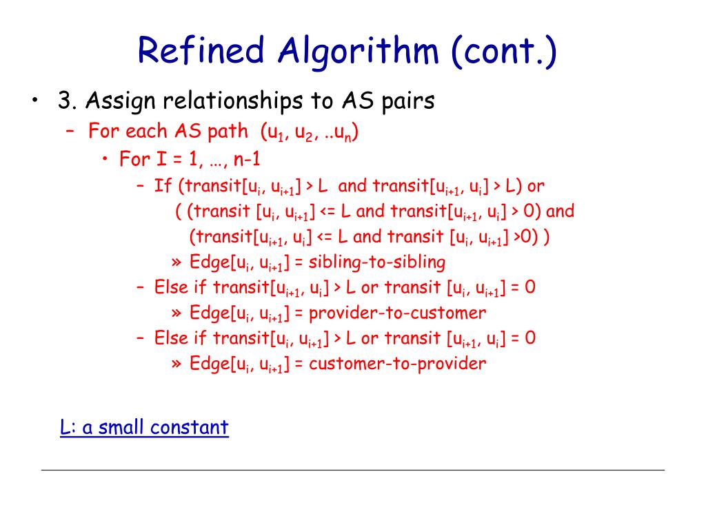 Refined Algorithm (cont.) • 3. Assign relationships to AS pairs • For each AS path (u1, u2, ..un) • For I = 1, …, n-1 • If (transit[ui, ui+1] > L and transit[ui+1, ui] > L) or ( (transit [ui, ui+1] <= L and transit[ui+1, ui] > 0) and (transit[ui+1, ui] <= L and transit [ui, ui+1] >0) ) • Edge[ui, ui+1] = sibling-to-sibling • Else if transit[ui+1, ui] > L or transit [ui, ui+1] = 0 • Edge[ui, ui+1] = provider-to-customer • Else if transit[ui, ui+1] > L or transit [ui+1, ui] = 0 • Edge[ui, ui+1] = customer-to-provider L: a small constant