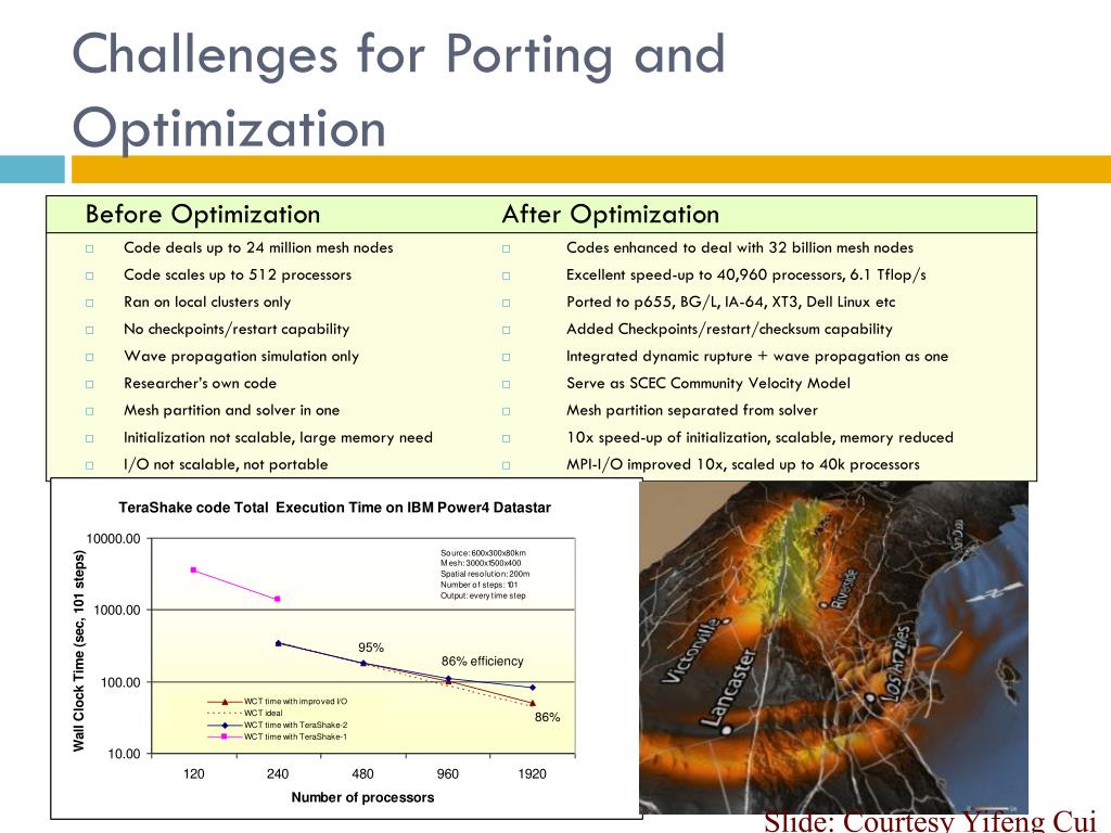 Before Optimization Code deals up to 24 million mesh nodes Code scales up to 512 processors Ran on local clusters only No checkpoints/restart capability Wave propagation simulation only Researcher’s own code Mesh partition and solver in one Initialization not scalable, large memory need I/O not scalable, not portable After Optimization Codes enhanced to deal with 32 billion mesh nodes Excellent speed-up to 40,960 processors, 6.1 Tflop/s Ported to p655, BG/L, IA-64, XT3, Dell Linux etc Added Checkpoints/restart/checksum capability Integrated dynamic rupture + wave propagation as one Serve as SCEC Community Velocity Model Mesh partition separated from solver 10x speed-up of initialization, scalable, memory reduced MPI-I/O improved 10x, scaled up to 40k processors Challenges for Porting and Optimization Slide: Courtesy Yifeng Cui